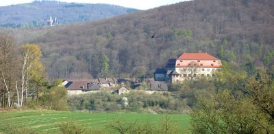 The rectangular stone structure of Schloss Arnstein features baroque portals and stands at an elevation of 265 meters between Werra and Leinetal valleys.