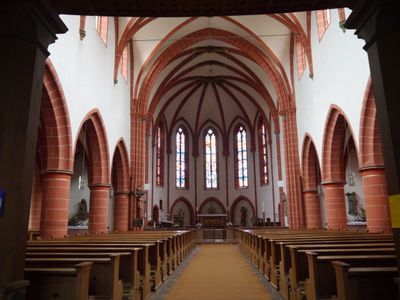 The St. Gallus Church stands with two towers, featuring red sandstone blocks and white plastered surfaces in its three-nave interior design.