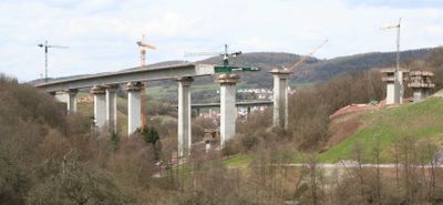The Kauppenbrücke stretches 488 meters across with a width of 36.6 meters, featuring two full-wall girders positioned 20 meters apart.