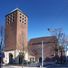 The church features a broad flat-roofed nave with narrow side aisles, two transepts, and a tower built separately from the main structure in campanile style.
