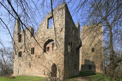 The fortress remains stand on a hill north of the town, containing the remnants of a Bergfried tower and the main Palas building.