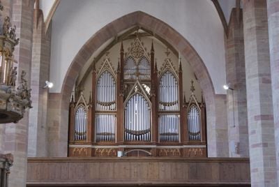 The organ in St. Moritz Church is a large instrument with multiple keyboards and many stops that give performers access to a wide range of sounds. It is built into the church space and serves both weekly services and special musical performances.