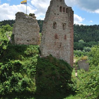 The Schenkenburg ruins include a 16-meter high keep stump and sections of the Palas, standing on a ridge at 391 meters elevation in Kinzigtal.
