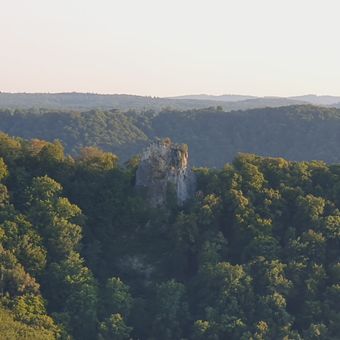 The Wielandstein ruins consist of five separate castle structures positioned along a rocky ridge above the Tobel Valley in Baden-Württemberg.