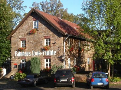 The Rote Mühle stands as a brick structure near the Ruhr River, featuring traditional watermill mechanisms and architectural elements from North Rhine-Westphalia.