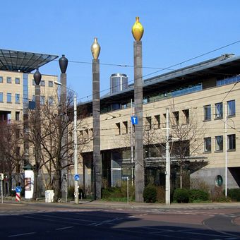 Along the street stands a former gasometer transformed into the Panometer, displaying large-scale panoramic exhibitions in a cylindrical industrial structure.
