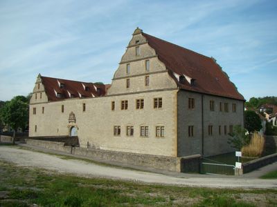 The three-winged Renaissance castle features a round tower at its northeastern corner and stands protected by high walls with a main portal.