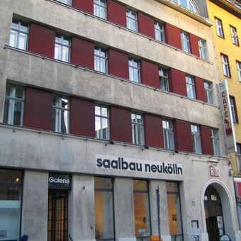 The Saalbau Neukölln occupies a substantial building on Karl-Marx-Straße, featuring multiple performance spaces and exhibition areas spread across different floors.