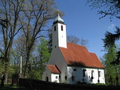 St. Clemens stands among dark coniferous forests with three poplar trees surrounding a waycross that leads to a small cemetery with iron crosses.