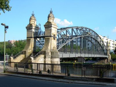 The Siemenssteg spans 77 meters across the Spree River, featuring a metal arch design and two 10-meter-high sandstone pylons at each bridge head.