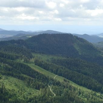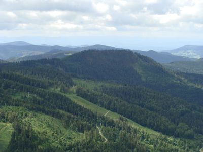 The Silberberg summit rises to 1358.2 meters above sea level, featuring steep northern drops and rocky formations within the Black Forest mountain range.