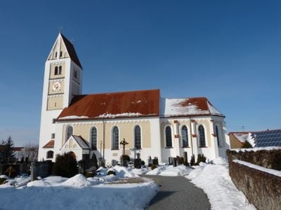 The stone church of St. Stephan stands at Kirchplatz 1, featuring a traditional Bavarian architectural design with a prominent bell tower and ornate windows.