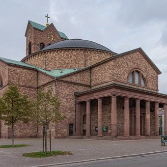St. Stephan is a Catholic church in Karlsruhe's Innenstadt-West district featuring neoclassical architecture and a central dome positioned above a Greek cross floor plan. The structure displays unplastered facades and is topped by a 43-meter tower that can be seen from multiple locations throughout the city center.