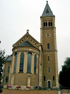 The stone walls of St. Stephanus feature rounded arches, massive stone foundations, and decorative arcading elements following the Romanesque Revival style.