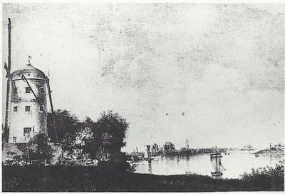 The windmill emerged from a round tower documented in 1209, which belonged to the Roman fleet castle Alteburg and later transformed into a Dutch-style mill after 1782.