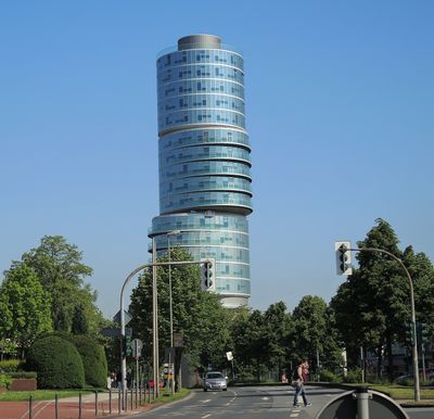 The Exzenterhaus reaches a height of 90.5 meters with its glass facade and consists of three sections shaped like polycentric rings extending outward from the central core.