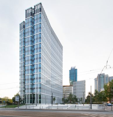 St Martin Tower is a modern high-rise with 18 floors rising to 70 meters in the Innenstadt II district. The building features contemporary architecture with office spaces designed to capture natural light through balconies positioned on the facade.