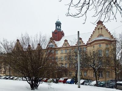 The structure combines educational functionality with protected monument status, representing both active learning and architectural preservation in Leipzig.