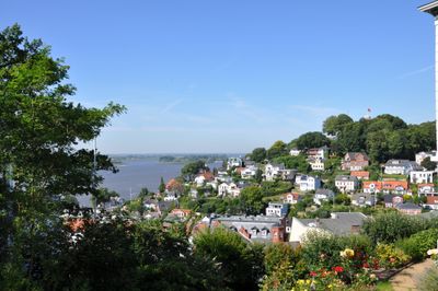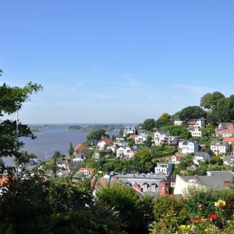 The neighborhood contains narrow passages between properties, leading through gardens and past traditional thatched-roof houses that face the Elbe River.