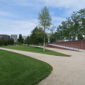 The park connects to public transportation through the HafenCity University U4 subway station and multiple bus lines, offering recreation areas with benches, playgrounds, and green spaces.