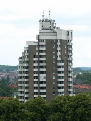 The structure contains 128 residential units across 18 floors, making it the tallest residential building in the city of Osnabrück.