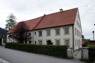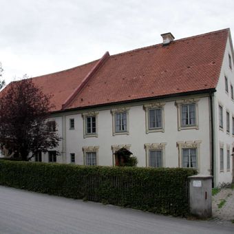 Pfarrhaus Unterammergau, zweigeschossiger stattlicher Satteldachbau, 1758, Fassadenmalerei modern