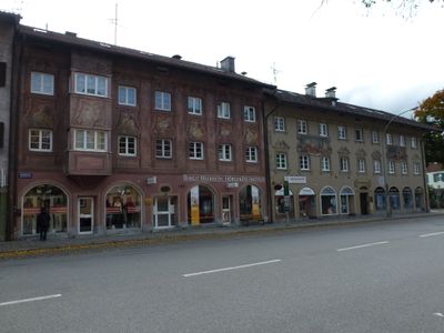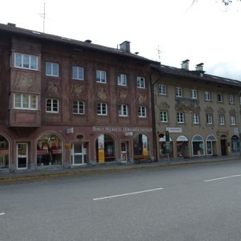 Wohn- und Geschäftshäuser, dreigeschossigen Flachsatteldachbauten im alpenländischen Heimatstil gegenüber dem Rathaus, Teil einer nicht vollendeten Rathausplatz-Gestaltung von 1935; Fassadenbemalungen- und Stuckierungen teils von Oswald Bieber