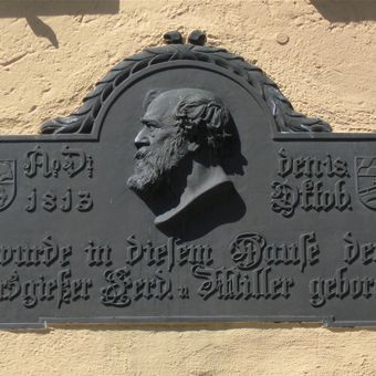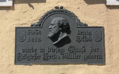 Hauptstraße 15, Relieftafel zur Erinnerung an das bereits abgebrochene Geburtshaus von Ferdinand von Miller, Bronze, wohl 1936;