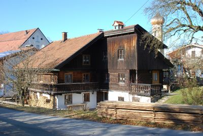 Beim Hinterbacher, Handwerkerhaus, ehemalige Hammerschmiede. Obergeschoss verschalter Blockbau, Balusterlaube, östlich vorgezogener Pultdachvorbau, zweite Hälfte 18. Jahrhundert