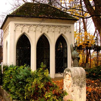 The Kapelle zur Schmerzhaften Muttergottes features a single-hall construction with barrel vaulting and a pentagonal choir section on its southern side.
