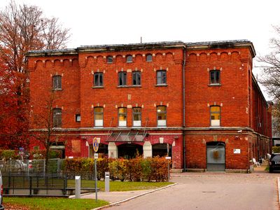 Ehem. Artillerie-Depot, dreigeschossiger Blankziegelbau mit turmartigen Eckrisaliten und getrepptem Bogenfries an der Traufleiste, 1897