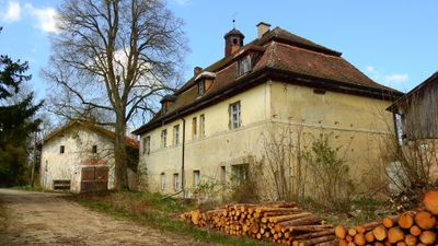 Gutshof an Stelle der Vorburg der mittelalterlichen Burg der Herren von Polanten, dann der Familie von Morsbach, Medieval castle remains in Greding, Germany.