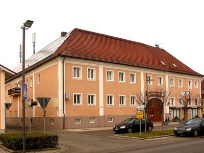 Gasthof, Wohn- und Geschäftshaus, zweigeschossiger Walmdachbau mit Putzgliederung und angesetztem Südflügel, 18. Jahrhundert