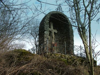 Steinernes Kreuz, am Sockel Wappen des Fürstabts Honorius Roth von Schreckenstein (1760–85), Sandstein, wohl zweite Hälfte 18. Jahrhundert;in Grottenarchitektur eingestellt