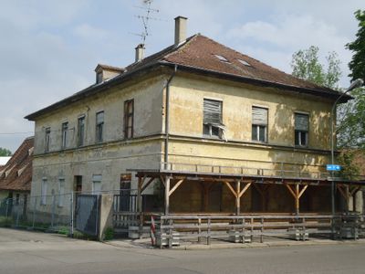 Zwei Stadel, sogenannte Lechhütten, zum städtischen Bauhof gehörend, eingeschossige Satteldachbauten, östlicher Stadel teilweise mit Fachwerk, von Elias Holl, 1611 und 1630, Dachstuhl des östlichen Stadels 18. Jahrhundert