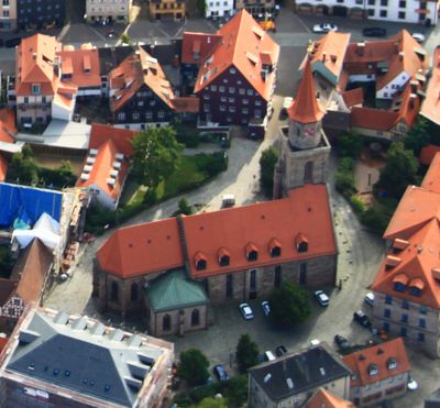 St. Michael, Sandsteinquaderbau mit Satteldach, polygonalem Ostchor mit Strebepfeilern, quadratischem Westturm mit Blendbogenfriesen und oktogonalem Aufsatz mit Spitzhelm und im Norden Sakristei mit Walmdach, saalförmiges Langhaus mit dreiseitig umlaufenden Holz
