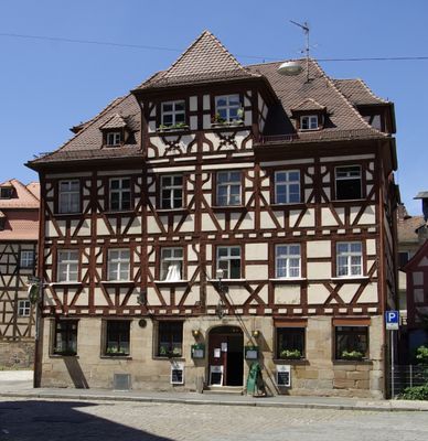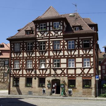 Gaststätte Zum Tannenbaum, Dreiseitig freistehender, dreigeschossiger Fachwerkbau in Ecklage, mit Sandsteinerdgeschoss, Walmdach und Fachwerk-Zwerchhäusern, um 1700, massives Erdgeschoss bezeichnet „1803“