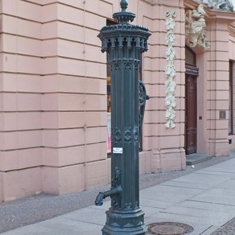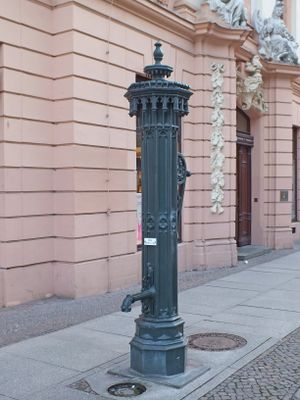 Handschwengelpumpe Brühl, Handschwengelpumpe mit Brunnenschacht und Abdeckplatte vor dem Romanushaus