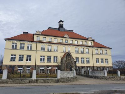 Gerhart-Hauptmann-Schule mit Sonnenuhr Gerhart-Hauptmann-Straße 4, Baugeschichtlich und ortsgeschichtlich von Bedeutung, Schulbau mit Mittelbetonung und rustiziertem Eingangsportal mit Wappen, Turm, erhöhter Mittelbau mit Sonnenuhr und Akroterien