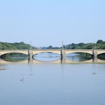 The Zeppelinbrücke spans 155.8 meters across the Elster basin, featuring concrete arches and dedicated lanes for trams, vehicles, bicycles, and pedestrians.