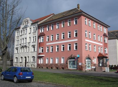 Mietshaus Paunsdorfer Straße 20, Mietshaus (Naturstein- und Putzfassade) in halboffener Bebauung; stattlicher Bau mit aufwendig gestaltetem Erker und Erdgeschoßzone