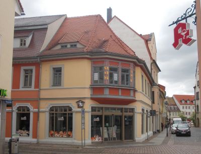 Bäckerstraße 14, Wohnhaus in geschlossener Bebauung in Ecklage mit Laden, in städtebaulich wichtiger Position in Marktrandlage, künstlerisch markanter Erker der 1930er Jahre mit Sternzeichen-Reliefs, 2-geschossig, ursprünglich waren es vermutlich 2 Gebäude