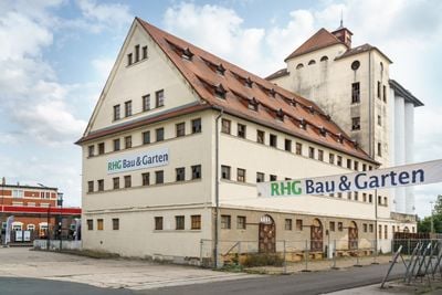 Speichergebäude, Speicherbau mit angebautem Siloteil, architektonisch interessanter Getreidespeicher von ortsbildprägender Wirkung (Architekt: Max Fricke), dreigeschossiger Riegel mit Schüttböden und 12 Silohochbehälter