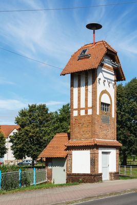 Transformatorenturm Lindenstraße 22, qualitätvolles Zeugnis für die Elektrifizierung des Ortes, mit technikgeschichtlicher Bedeutung, dorfplatzprägend roter Klinkersockel, Gliederung des Baukörpers mittels rotem Klinker und Putzfeldern mit vertikaler Betonung, Kaffgesims, Walmdach (