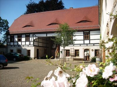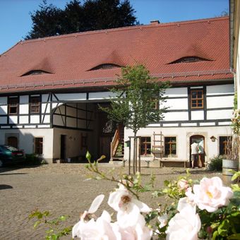 Wohnstallhaus, Torhaus, Scheune und Seitengebäude sowie Bauerngarten eines Vierseithofes Auterwitz 13, house in Zschaitz-Ottewig, Germany