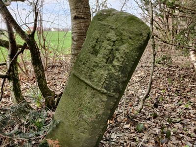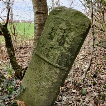 Wappenstein Freiwald -, Natursteinstele mit Freiberger Wappen und Inschrift, ortsgeschichtlich von Bedeutung. Sog. Wappenstein in Form einer schlanken, teils scharrierten Natursteinstele mit Sockel, sich leicht verjüngendem Schaft und abgerundetem Abschluss, oberer Schaft
