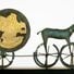 The Trundholm Sun Chariot is a Bronze Age find from Copenhagen Municipality that consists of a bronze horse pulling a disk mounted on six wheels. The disk measures about 50 centimeters (20 inches) from end to end and is covered with thin gold on one side while the other side remains plain.