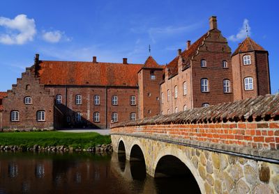 The castle stands on an elevated bank surrounded by an artificial lake, featuring three wings constructed in red brick with two capped corner towers.