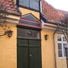 The yellow and brown half-timbered theater building features a red-tiled roof at the intersection of Teaterstræde and Østergade in Rønne, Bornholm.