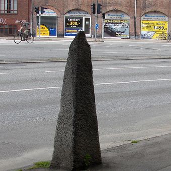 The granite stone, measuring 160 centimeters in height and 50 by 35 centimeters at ground level, stands on the sidewalk along Åboulevarden street.
